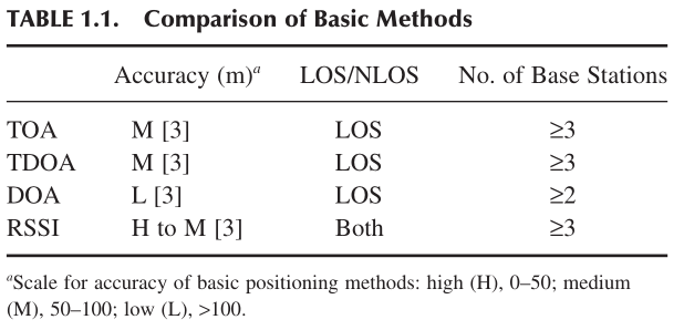 Table 1.1 compares basic positioning methods previously discussed in the chapter in terms of accuracy, a need for the availability of LOS, and the number of base stations required for localization.