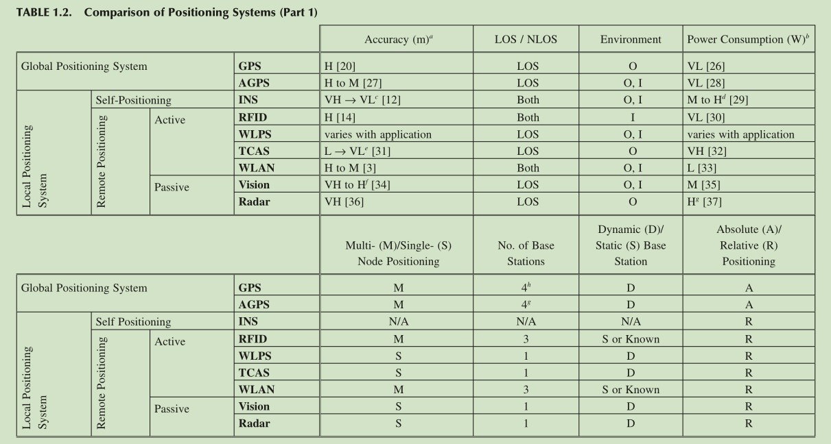 Table 1.2 compares different positioning systems based on several parameters.