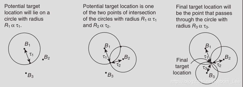 令Δt为发射信号与从目标反射的接收信号之间的时间; TOA是Δt的一半。 使用TOA,可以获得物体与雷达的距离(见图1.4d)。 假设已知雷达发射器的位置,可以使用计算的到物体的距离来定位目标。