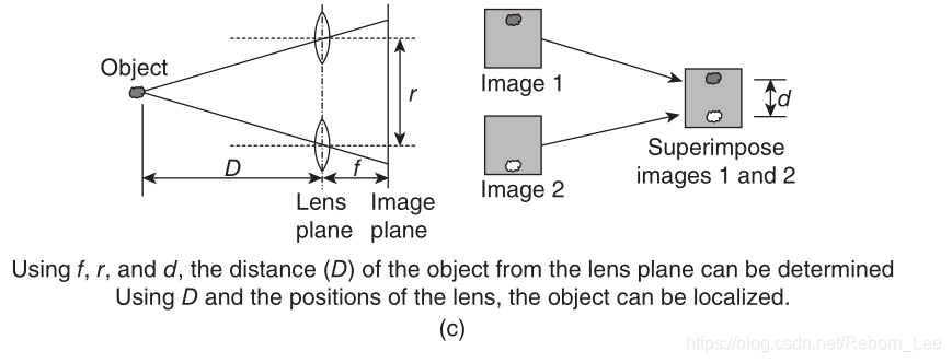 叠加这些图像,可以确定对象位置的视差d。 假设摄像机之间的距离r和摄像机的焦距f是已知的,可以计算物体距摄像机镜头平面的距离D. 给定两个透镜的已知位置和计算的距离D,可以定位目标对象。