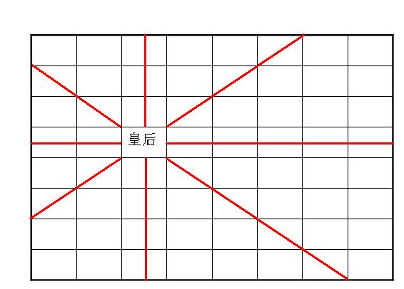来自百度百科,皇后的走法是可以横竖斜着走任意格。