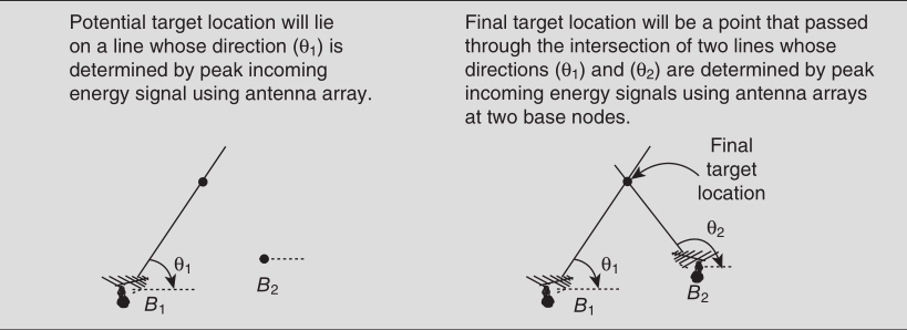 Final target location will be a point that passed through the intersection of two lines whose directions (θ 1 ) and (θ 2 ) are determined by peak incoming energy signals using antenna arrays at two base nodes.