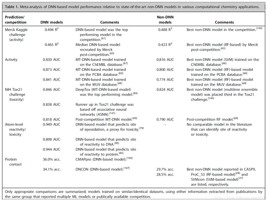 Merck于2015年发表的一项随后研究综合分析了DNN的培训,并将其性能与该领域当前使用的基于RF的模型的性能进行了比较,并将其扩展到Merck挑战数据集。作者总结说,DNNs可以作为一种实用的QSAR方法被采用,并且在大多数情况下容易胜过射频模型。就实际采用而言,作者强调了DNN利用的GPU硬件的巨大进步,以及与传统机器学习模型使用的传统CPU集群相反的部署GPU资源的经济成本优势。还研究了与训练深度神经网络相关的关键问题,特别是可调参数的数量。作者发现,大多数单任务问题可以在具有两个隐藏层的架构上运行,每层仅使用500-1000个神经元,并且使用75个训练时期。更复杂的体系结构和/或更长的培训时间可以提高模型精确度的回报,但增量递减。尽管在上文总结的Merck挑战和相关研究中,DNN总体上表现良好,但研究界的一些从业人员对此结果持怀疑态度。常见的问题包括样本量小,并且面对模型复杂性的增加,预测准确性的渐进式改进难以证明其合理性。