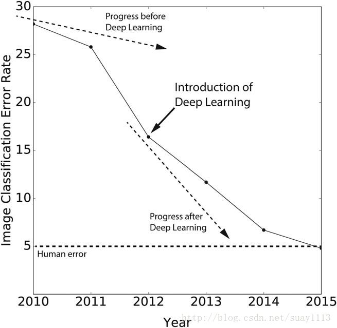 图4. 年度ImageNet竞赛中表现最好的图像分类算法的历史错误率。已建立的计算机视觉模型停滞在25-30%。 2012年引入深度学习使得图像分类的显着改善达到了~15%,到2015年实现了图像分类的人类精确度(~5%)。