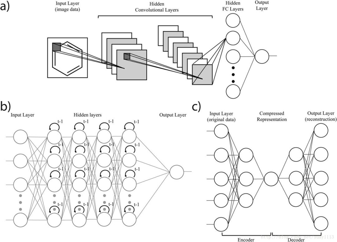 图3. a)卷积神经网络(CNN)的示意图。 CNN的设计明确假定输入是以图像数据的形式。 每个卷积层提取和保存空间信息并学习一个表示,然后典型地将其传递到输出层之前的传统完全连接的前馈神经网络。 b)循环神经网络(RNN)的示意图。 最简单实现的RNN是对标准前馈神经网络的修改,其中隐藏层中的每个神经元从模型的前一次迭代的输出接收附加输入,表示为“t-1”圆形箭头。 c)自编码器的示意图,它是用于无监督学习的神经网络。 在自动编码器中,目标是学习输入层的标识函数,并且在该过程中,隐藏层中原始数据的压缩表示被学习。