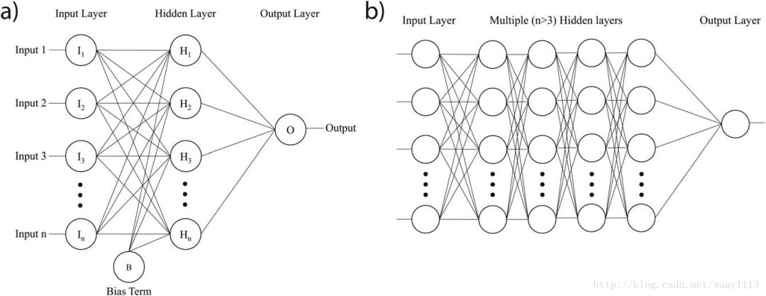 图1. a)具有一个隐藏层的传统前馈人工神经网络(ANN)的示意图。 每个表示为圆圈的神经元接受一系列n个输入值,并将其映射到使用非线性函数的输出,并将隐含层的所有神经元应用于偏置项(即输入为零时的神经网络输出)。 b)深度神经网络(DNN)与人工神经网络的不同之处在于具有多个(n> 3)隐藏层,如示意图所示,为简单起见,这里省略了偏差项