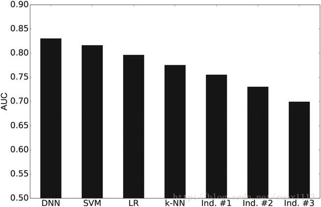 图7.深度神经网络与几种传统机器学习算法的性能准确性(就AUC度量而言),包括:支持向量机(SVM),逻辑回归(LR),k-最近邻(k-NN)和商业实现 解决方案(Pipeline Pilot Bayesian分类器,分别基于Parzen-Rosenblatt KDE的方法和相似性集成方法),用于从ChEMBL获得的策展数据库的活动预测。