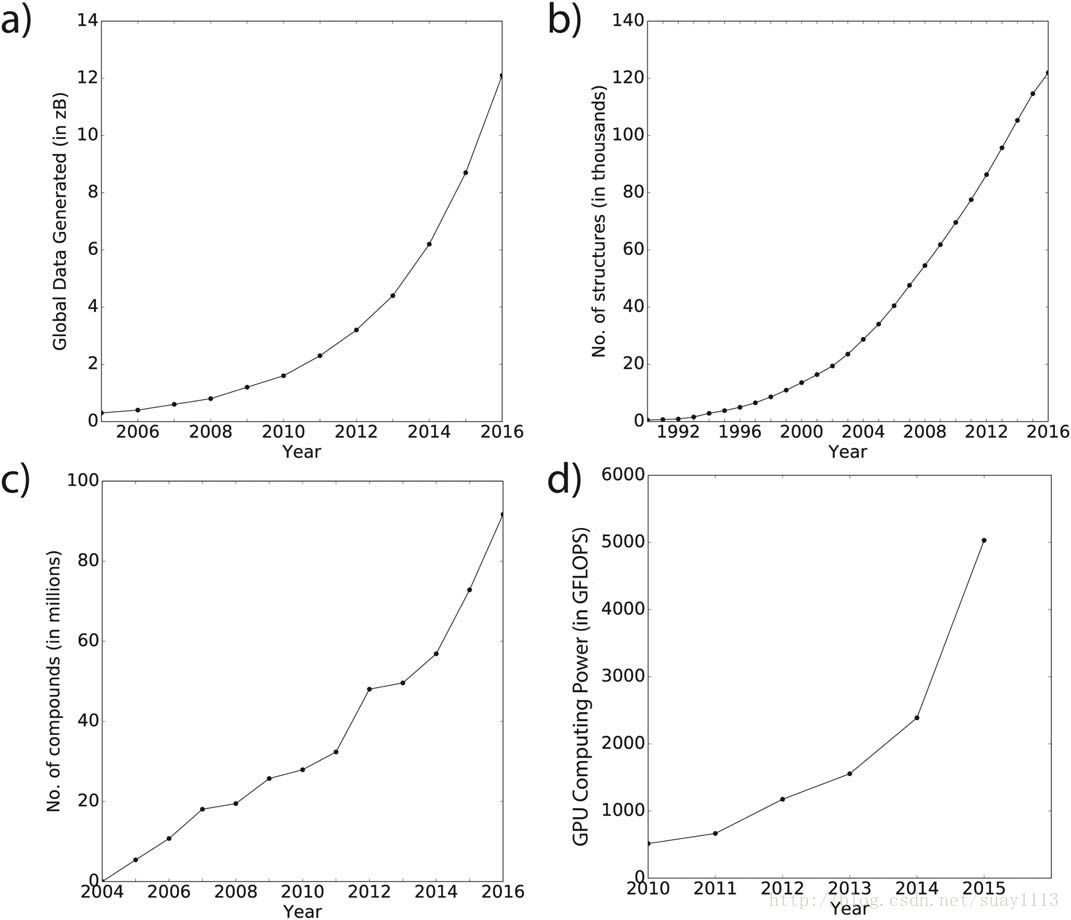 图6. a)生成的全球数据,b)保存在蛋白质数据库中的结构数量,c)保存在Pub-Chem中的化合物数量,以及d)用于科学计算的GPU计算能力(GPU计算功率数据点 (2010年),M2090(2011年),K20(2012年),K40(2013年),K80(2014年),P100(2012年),P100(2011年),NVIDIA Tesla系列GPU的双精度计算能力, 2015)),在它们向上的轨道上都有类似的相似之处
