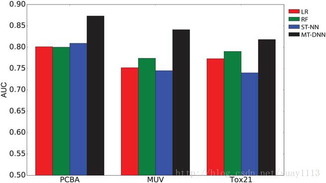 图8.当使用多任务深度神经网络(MT-DNN)时,与逻辑回归(LR)、随机森林和单任务神经网络(ST-NN)相比,在3个不同数据库(PCBA,MUV,Tox21)中观察到的准确性(以AUC度量指标) (RF)。
