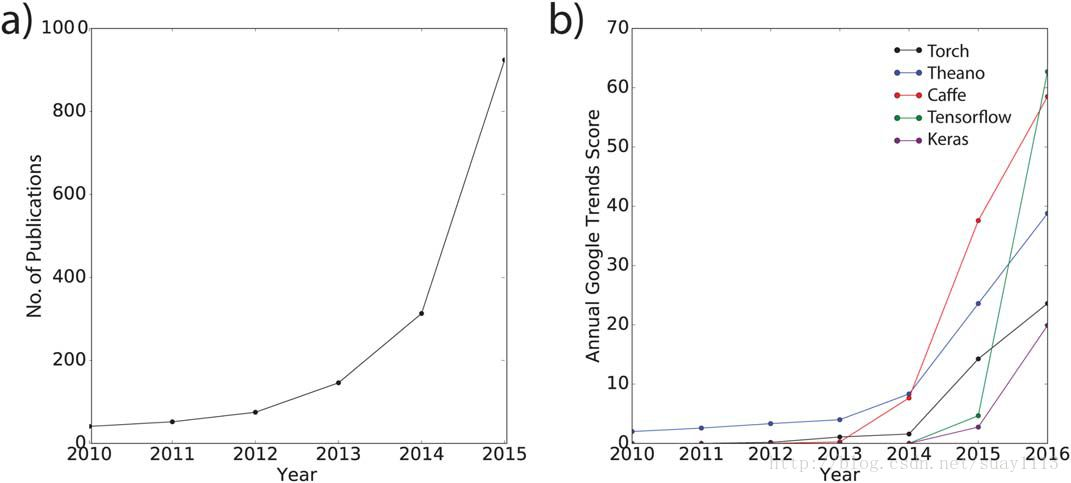图5. 来自ISI索引的 a)深度学习出版物的增长情况,以及 b)2010年以来主要深度学习软件包的年度Google趋势得分。