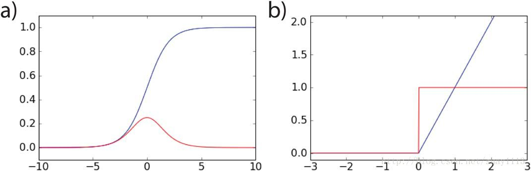 图2. a)S形和 b)整流线性(ReLU)函数(蓝色)及其相应的一阶导数(红色)的图。 与sigmoidal函数不同,其中的导数根据x的值而变化,在ReLU函数中,一阶导数为0或1。[Color figure can be viewed at wileyonlinelibrary. com]
