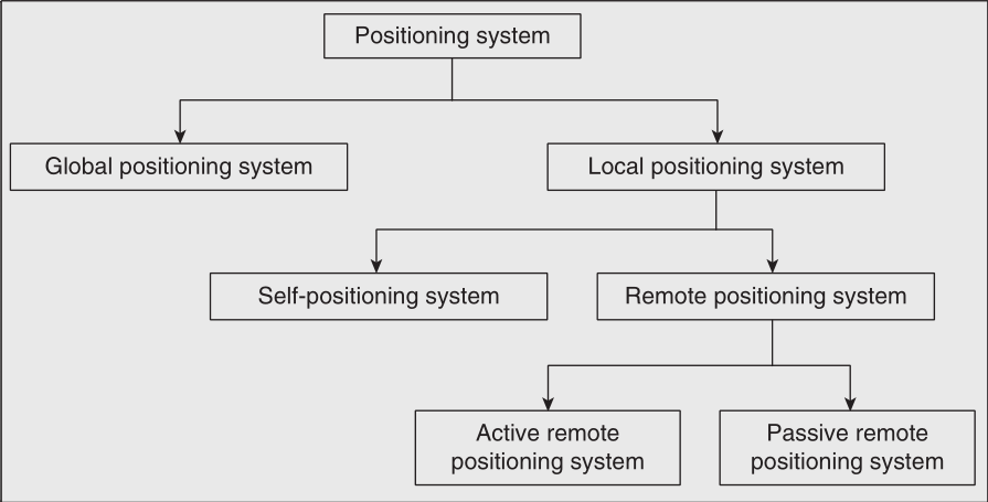In the first case, the target is active and cooperates in the process of positioning, while in the second, the target is passive and noncooperative. Examples of active target positioning systems are radio frequency identifi cation (RFID), wireless local positioning systems ( WLPSs ) [2] , and traffi c alert and collision avoidance systems ( TCAS ) [2] . Examples of passive target positioning systems are tracking radars and vision systems. Figure 1.1 summarizes the classifi cation of positioning systems.