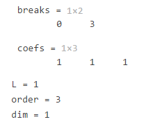 Polynomial coefficients, returned as an L-by-k matrix with each row coefs(i,:) containing the local coefficients of an order k polynomial on the ith interval, [breaks(i),breaks(i+1)].