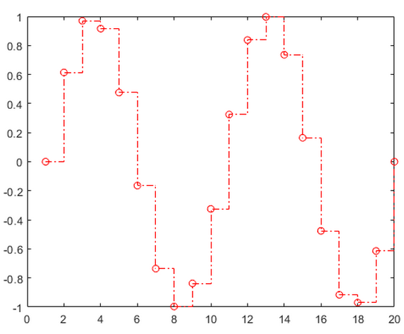 Create a stairstep plot and set the line style to a dot-dashed line, the marker symbol to circles, and the color to red.