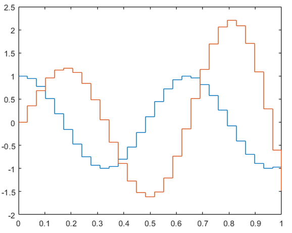Evaluate two cosine functions at 50 equally spaced values between 0 and and create a stairstep plot using plot.