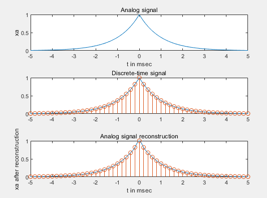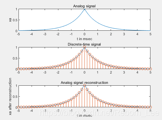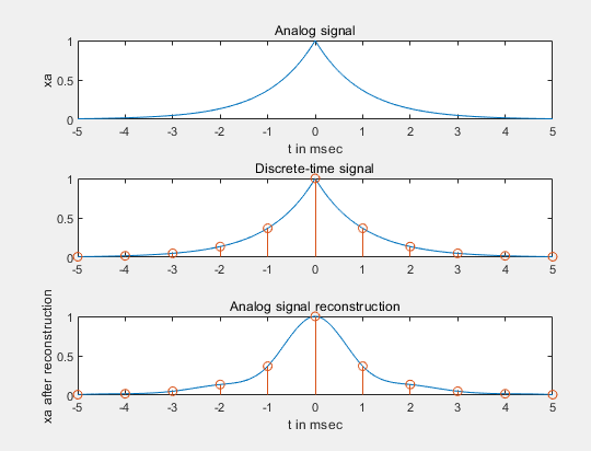 重建和真正的模拟信号之间的误差是0.0317,这是由于非理想内插和非带限造成的。将这个误差与sinc函数内插比较(理想),这个误差还比较小。从重构图上看,重建还是不错的。