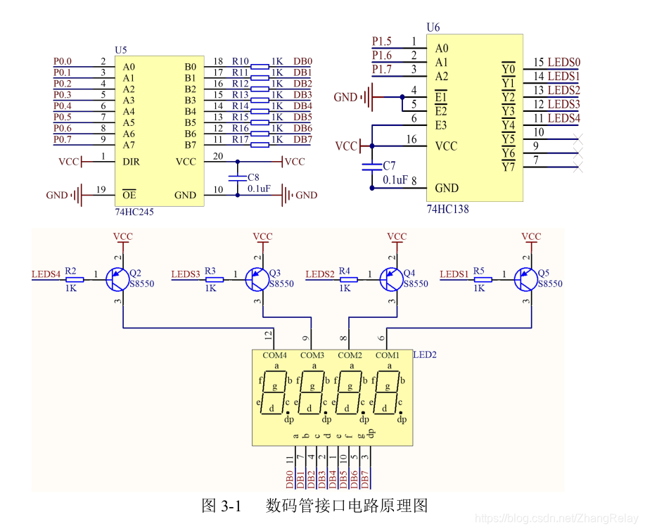 编程实现8段数码管的动态扫描显示,要求4个数码管从左到右分别显示“1”、“2”、“3”、“4”、及“A”、“b”、“C”、“d”。