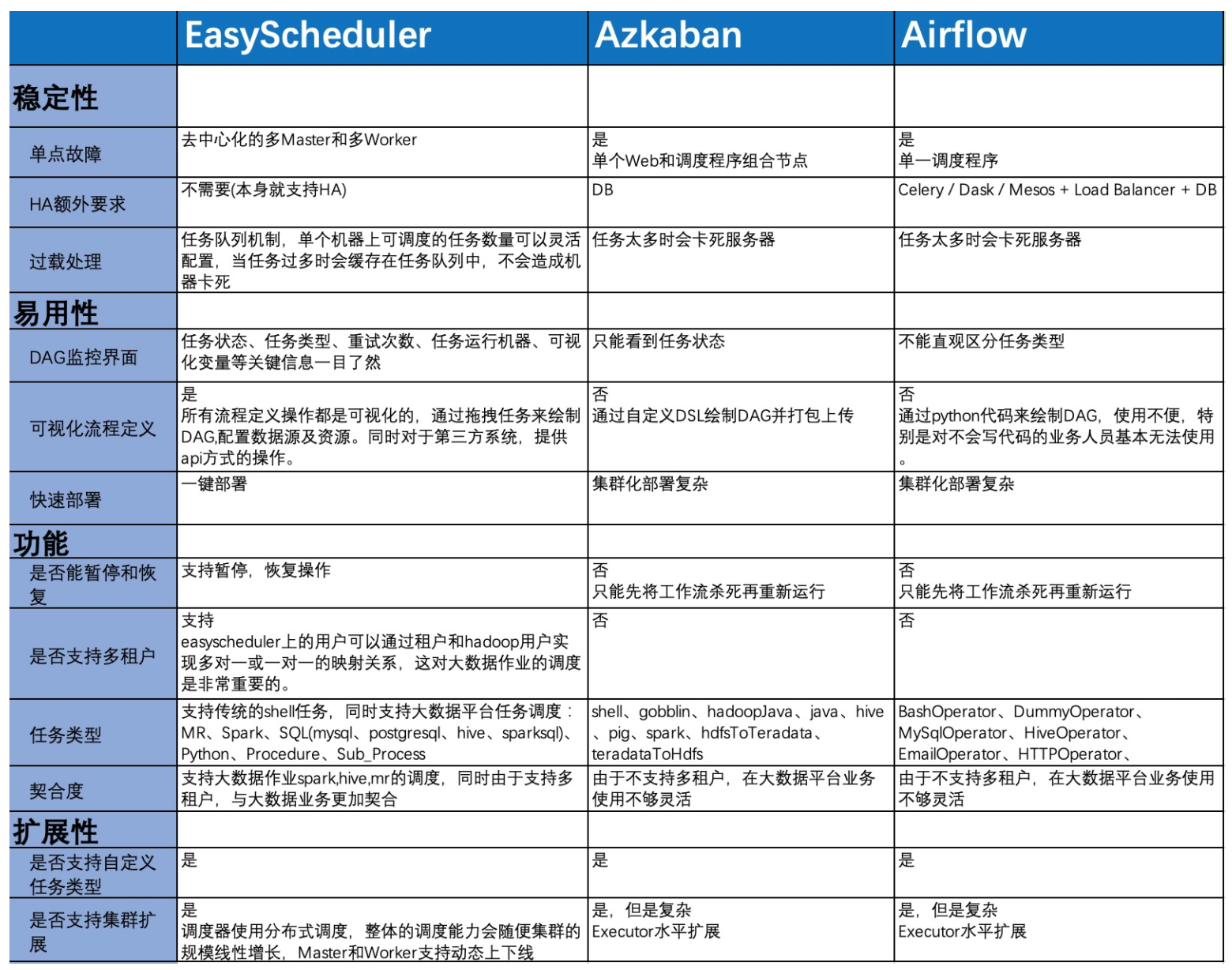 海豚调度常用的部署方式有五种,分别是单机部署、集群部署、Docker部署、Kubernetes部署、SkyWalking-Agent部署。Apache DolphinScheduler 之前的名字是 Easy Scheduler,它和同类调度系统的对比图如下: