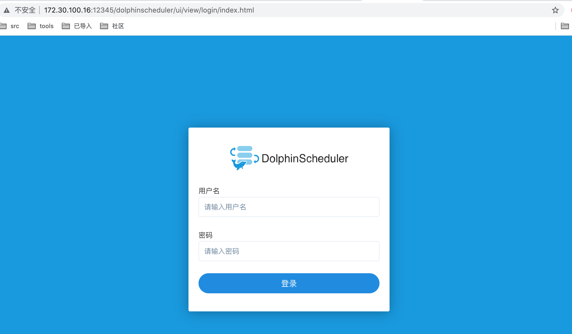 dolphinscheduler服务默认端口是12345,服务地址为 http://127.0.0.1:12345/dolphinscheduler。访问服务地址,出现如下图所示的登陆界面。其中,默认的用户是admin,默认的密码是dolphinscheduler123。