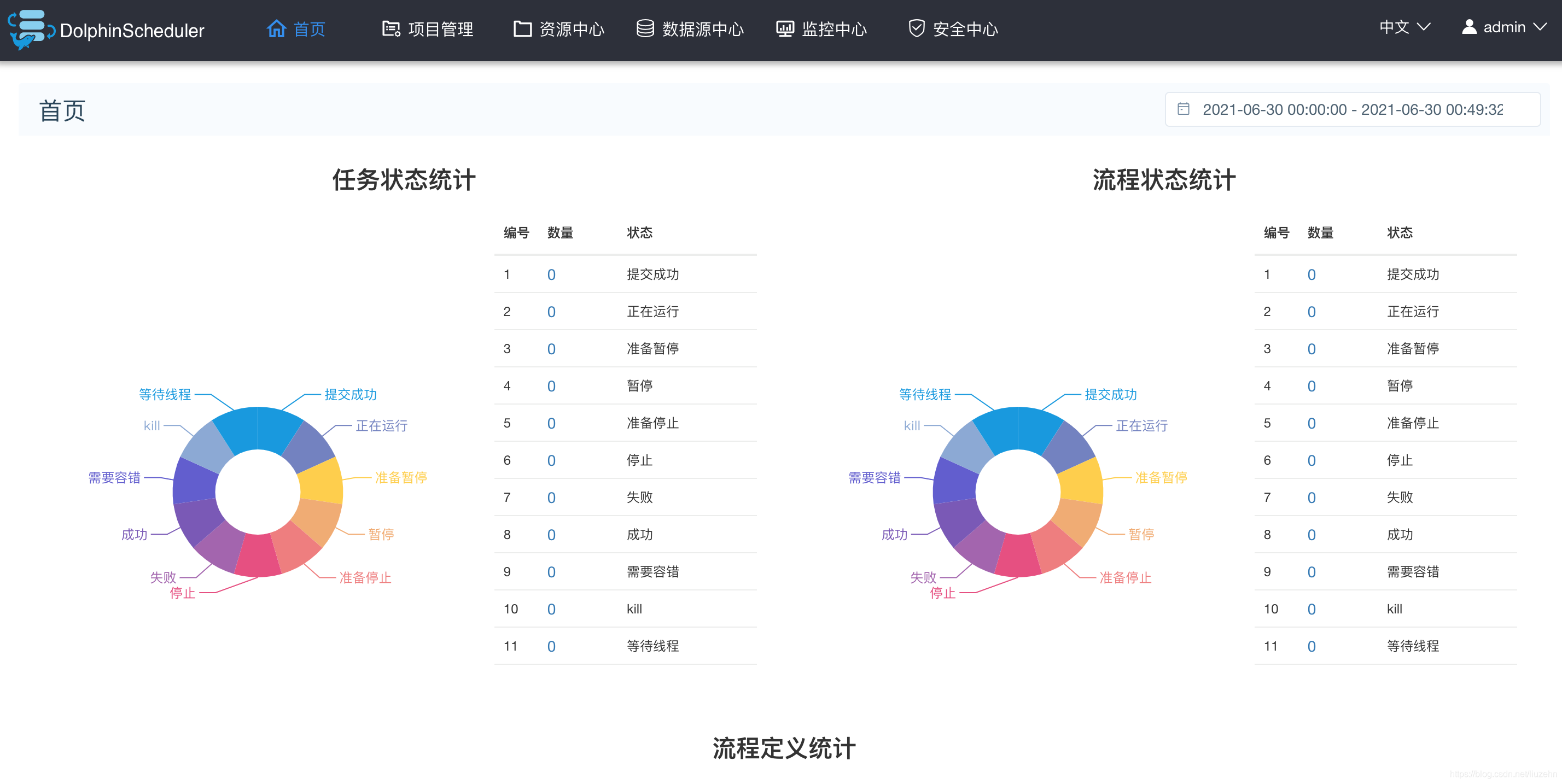 输入用户名和密码后,我们进入dolphinscheduler服务首页,显示了服务任务状态的统计信息以及流程状态的统计信息,具体内容如下所示: