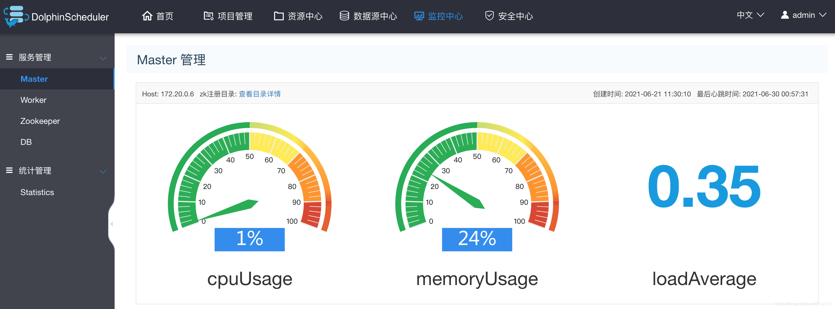 在监控中心里,我们可以查看master、worker、zookeeper、DB的运行状态,如下图所示,展示了master的CPU占用率是1%,内存利用率是24%,平均负载35%。