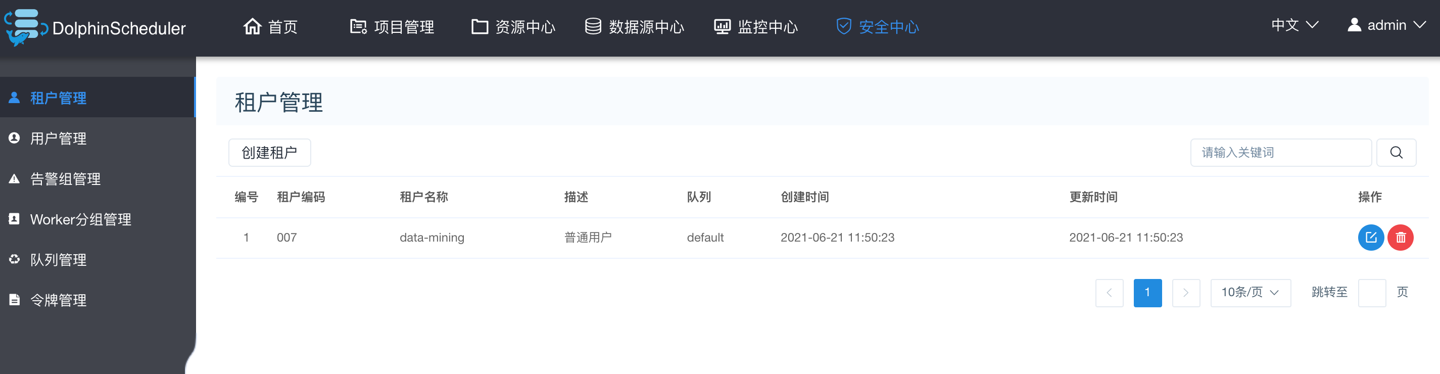 在安全中心,有租户管理、用户管理模块,同时支持告警组管理、worker分组管理、队列管理、令牌管理等内容。