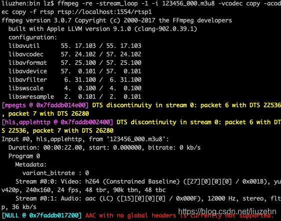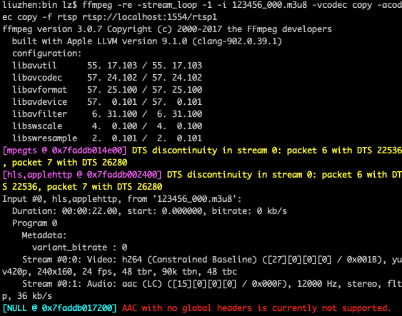 liuzhen:bin lz$ ffmpeg -re -stream_loop -1 -i 123456_000.m3u8 -vcodec copy -acodec copy -f rtsp rtsp://local