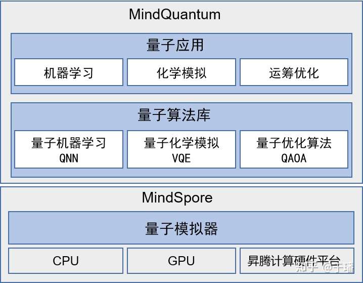 下图是MindQuantum的架构图,当前我们利用量子模拟器算子来对量子体系进行模拟,它可以完成前向传播和梯度计算的功能,在此基础之上,我们有量子算法库,例如量子神经网络啊、量子化学模拟的VQE和量子优化算法的QAOA等,再往上就有了量子应用,我们可以利用MindQuantum的量子算法来进行机器学习、化学模拟和运筹优化等任务。
