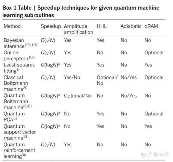 早在上个世纪,科学家就提出了用于机器学习的量子感知机概念。最近20年,越来越多的用于机器学习的量子算法被发掘出来,其中包括用于求解线性方程组的HHL算法,和基于此的量子主成分分析、量子支持向量机等。下图给出了各种量子机器学习算法对最好经典算法的加速效果。