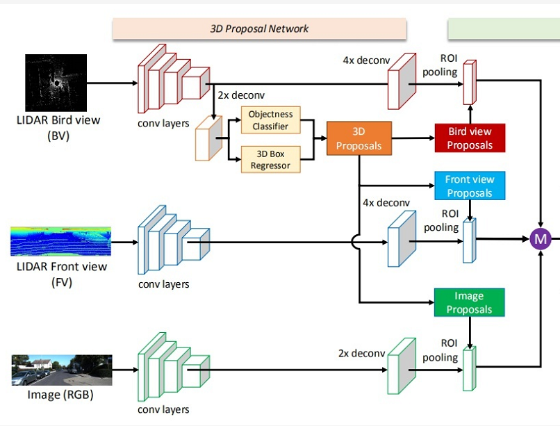 MV3D-Net融合了视觉图像和激光雷达点云信息;它只用了点云的俯视图和前视图,这样既能减少计算量,又保留了主要的特征信息。随后生成3D候选区域,把特征和候选区域融合后输出最终的目标检测框。