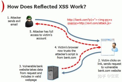 2、反射型 XSS: 当用受害者被引诱点击一个恶意链接,提交一个伪造的表单,恶意代码便会和正常返回数据一起作为响应发送到受害者的浏览器,从而骗过了浏览器,使之误以为恶意脚本来自于可信的服务器,以至于让恶意脚本得以执行。