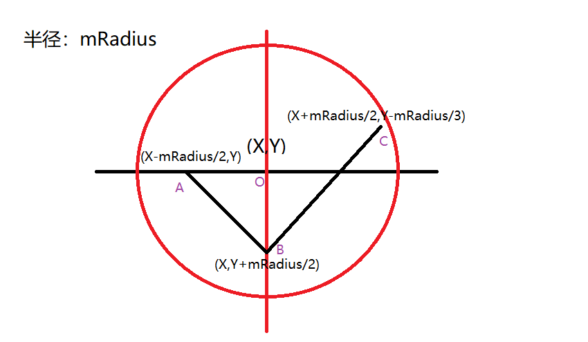 假设圆的半径为mRadius,圆心O坐标为(X,Y),我们把对勾的起点放在A点,假设A的坐标为在圆心平行线中间,那么A的坐标就是(X-mRadius/2,Y),同理,我们假设B的坐标也在圆心垂直线下中心,那么B的坐标为(X,Y+mRadius/2),因为在屏幕中,原点在屏幕的右上角,正方向X轴向右,正方向Y轴向下,所以这里是加,同理,C点肯定要接近圆的边缘,所以C的X轴肯定大于mRadius的一半,姑且我们这里设为X+mRadius/2,而Y也相对来说在上边,而Y不能超出圆外,所以我们根据cX = x + r * cos(a * π / 180);cY = y + r * sin(a * π / 180),计算出该X坐标在圆圈的坐标,小于这个坐标的Y轴设置就行,这里小编C点设置为(x+mRadius/2,Y-mRadius/3)。