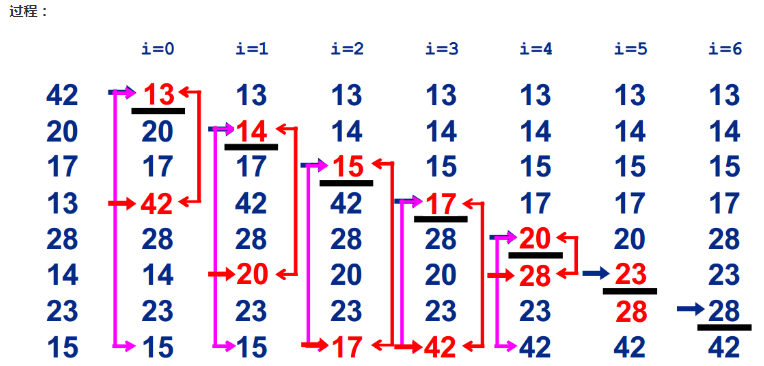 在长度为N的无序数组中,第一次遍历n-1个数,找到最小的数值与第一个元素交换; 第二次遍历n-2个数,找到最小的数值与第二个元素交换; 。。。 第n-1次遍历,找到最小的数值与第n-1个元素交换,排序完成。