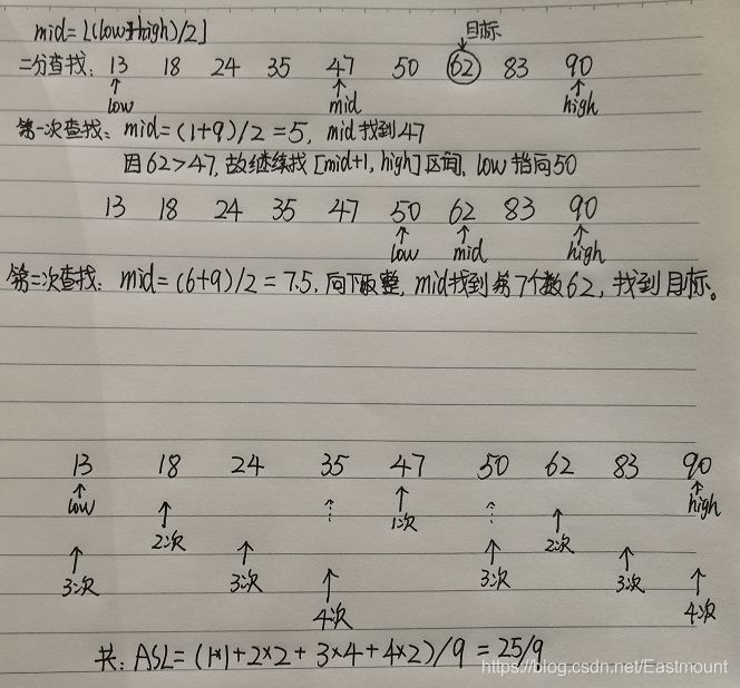 设一组有序的记录关键字序列为(13,18,24,35,47,50,62,83,90),查找方法用二分查找,要求计算出查找关键字62时的比较次数并计算出查找成功时的平均查找长度。