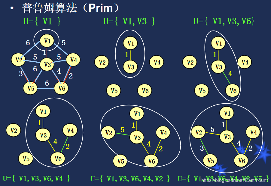 - 重复2)n-1次,即得到包含n个顶点和n-1条边的最小生成树。