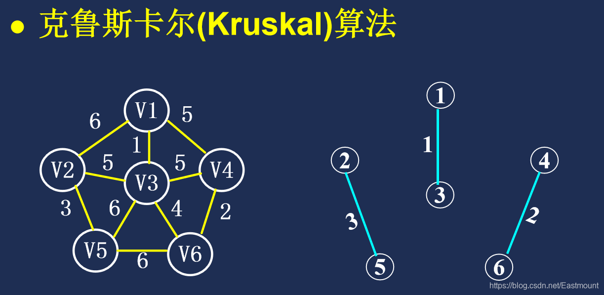 - 初始时最小生成树只包含图的n个顶点,每个顶点为一棵子树;
