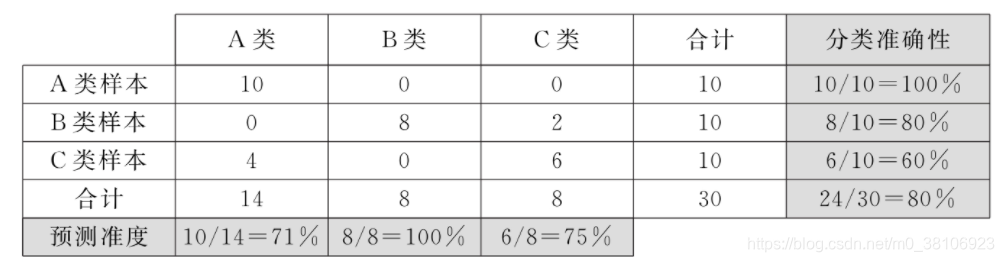 例如第一列中,分类至A类的14个样本中有10个来自A类的正确分类样本和4个来自C类的错误样本,由此可知,分类器对A类的预测准度为71%。表中的各行表示属于每类的样本被分类器分至不同类的情况。例如表中第二行,10个属于B类的样本有8个被正确分类,2个被错误地分至C类,因此分类器对B类的分类准确性为80%。