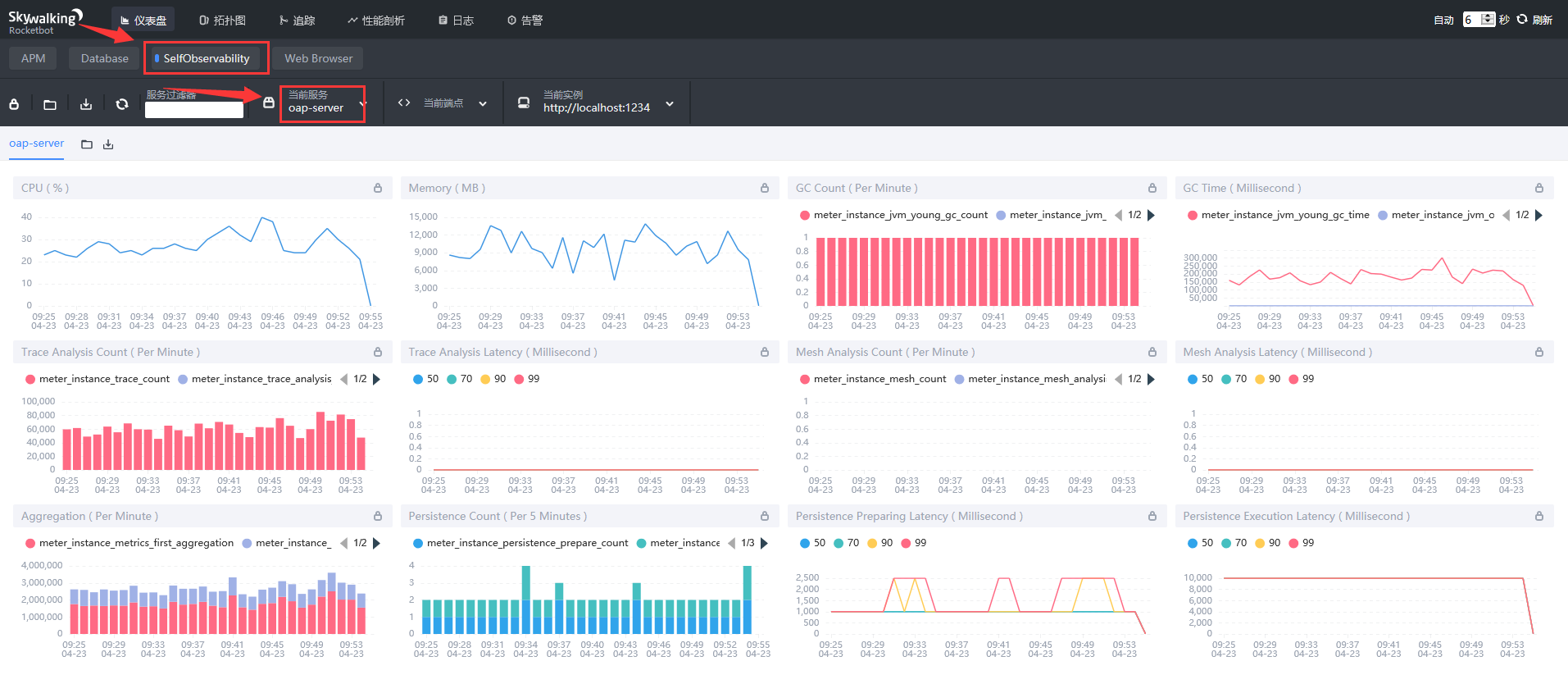 在 UI 中选择 SelfObservability ,然后在服务列表中选择 oap-server ,效果如下图: