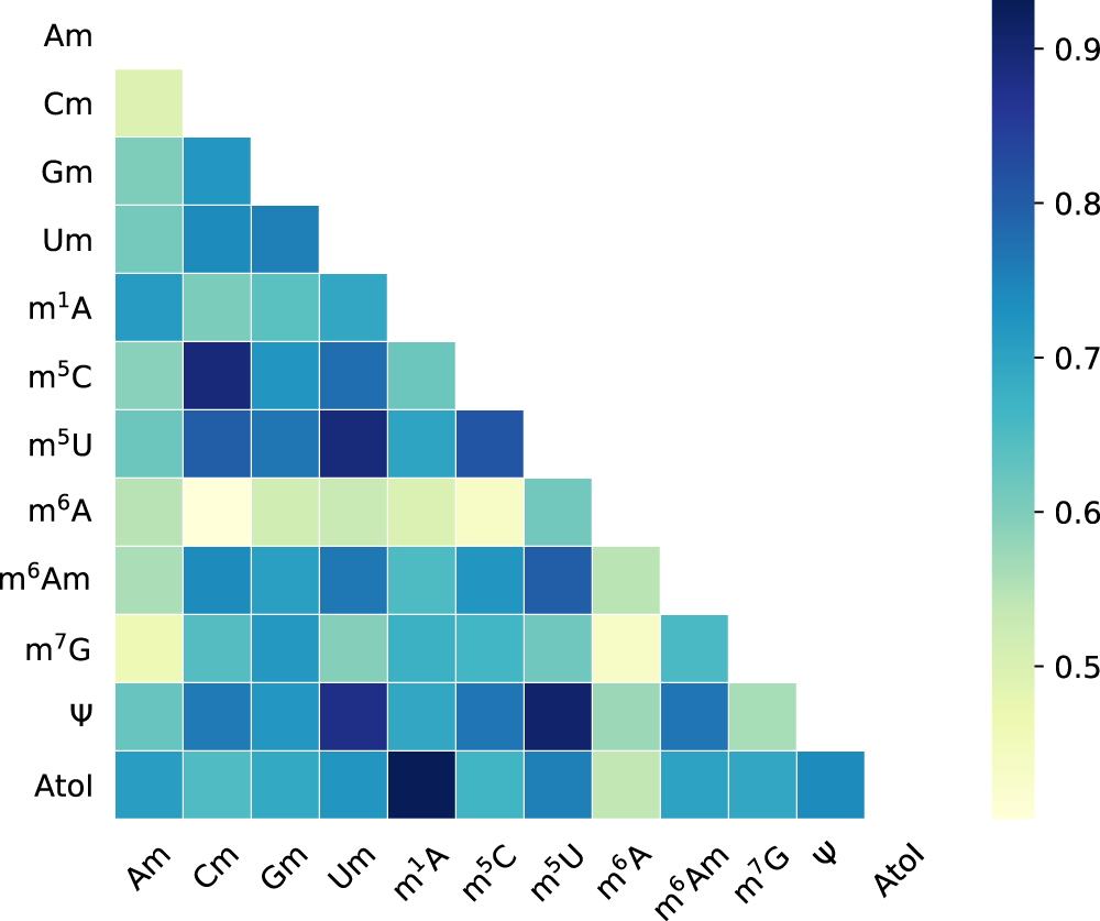 为了更好地理解不同RNA修饰之间固有的共享结构,作者提取了注意力机制中前馈神经网络的权重。这些权重分别为对应于12个RNA修饰的12个向量,并与模型的其他所有成分共同学习。通过计算每对向量的皮尔逊相关系数(ρ)来表示任意两种RNA修饰的相关性。如图3,RNA修饰之间都显示出强烈且显著的正相关,甚至包括那些来自不同核苷酸的修饰。这表明存在被多个RNA修饰密集修饰的区域,这些区域可能是基因调控的表观转录组层的关键调控成分。这些关键调控区域的序列特征很大程度上在不同的 RNA 修饰之间共享,并被模型成功捕获。值得注意的是,上述分析没有考虑RNA修饰的上下文特异性。