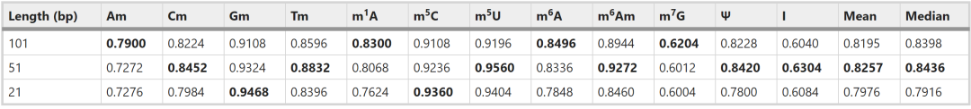 接着,为解决训练数据不平衡的问题,使用了OHEM和不确定性加权来优化模型,以51-bp的输入序列评估性能。作者将MultiRM和基准方法以及其他embedding技术进行了比较,结果如表2。其中MultiRM模型的平均值和中值得分最高,并且有6种RNA修饰性能最佳。