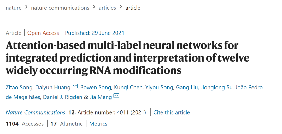 Song, Z., Huang, D., Song, B. et al. Attention-based multi-label neural networks for integrated prediction and interpretation of twelve widely occurring RNA modifications. Nat Commun 12, 4011 (2021).