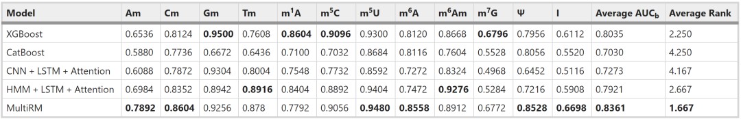 表2. MultiRM 与基准方法和其他嵌入技术的比较AUCb得分