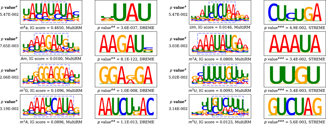 汇总在模型中发挥关键作用的共有模体时,作者发现它们中有许多与传统模体发现方法DREME和STREME解释的序列模式相匹配。因此,应用模体比较工具TOMTOM生成p值来量化通过MultiRM 和 DREME/STREME 获得的模体之间的相似性,如图2。