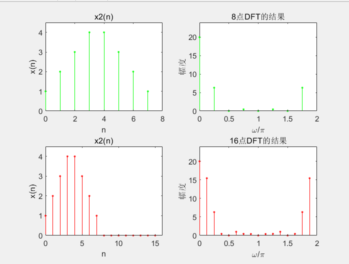 subplot(223); stem(0:N2-1,[x2 zeros(1,N2-8)],'.','r'); %时域补零到16点