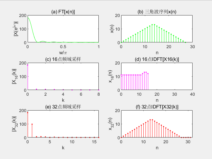 频域采样定理的图验证了频域采样理论和频域采样定理。对信号 x(n) 的频谱函数 X(ejω) 在 [0,2π] 上等间隔采样 N=16 时, N点IDFT[XNk]得到的序列正是原序列 x(n) 以 16 为周期进行周期延拓后的主值区序列,频域采样点数 N 必须大于等于时域离散信号的长度 M (即N≥M),才能使时域不产生混叠。