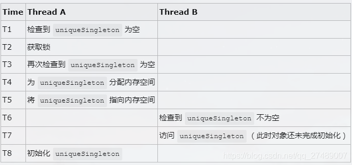 在这种情况下,T7时刻线程B对uniqueSingleton的访问,访问的是一个初始化未完成的对象。