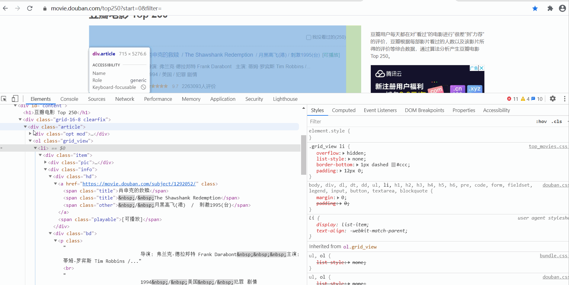 电影信息在 ol class 为 grid_view 下的 li 标签里,获取到所有li标签的内容,然后遍历,从中提取出每一条电影的信息。