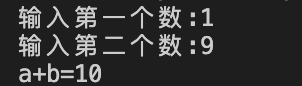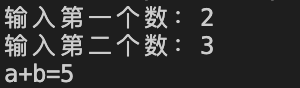 { int a; int b; cout<<"输入第一个数:"; cin>>a; cout<<"输入第二个数:"; cin>>b; int ans=a+b; cout<<"a+b="<<ans<<endl; return 0;