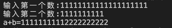 { string a; string b; string ans; cout<<"输入第一个数:"; cin>>a; cout<<"输入第二个数:"; cin>>b; int count=0; int i=a.length()-1;//a的长度-1 int j=b.length()-1;//b的长度-1 while(i>=0 || j>=0 || count!=0) { int x= i>=0? a[i]-'0':0; int y= j>=0? b[j]-'0':0; ans += ((x+y+count)%10+'0'); count = (x+y+count)/10; --i; --j; } //翻转 reverse(ans.begin(),ans.end()); cout<<"a+b="<<ans<<endl; return 0;