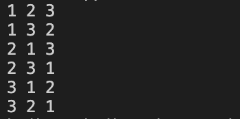 { // 初始化nums=[1,2,3] vector<int> nums; for (int i = 1; i <= 3; ++i) { nums.push_back(i); } // 结果返回值 vector<vector<int> > ans; ans = permute(nums); // 打印结果 for (int i = 0; i < ans.size(); ++i) { for (int j = 0; j < ans[i].size(); ++j) { cout << ans[i][j] << " "; } cout << endl; } return 0;